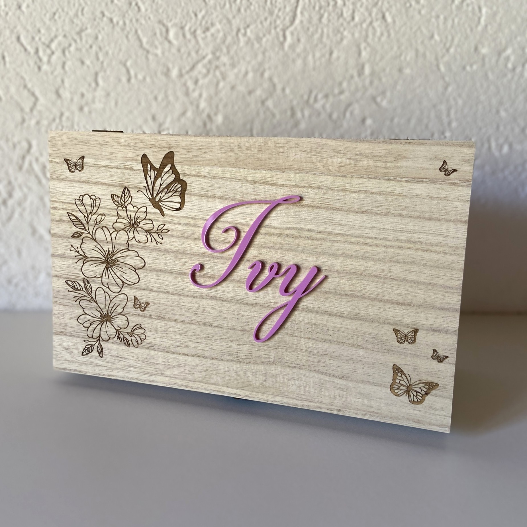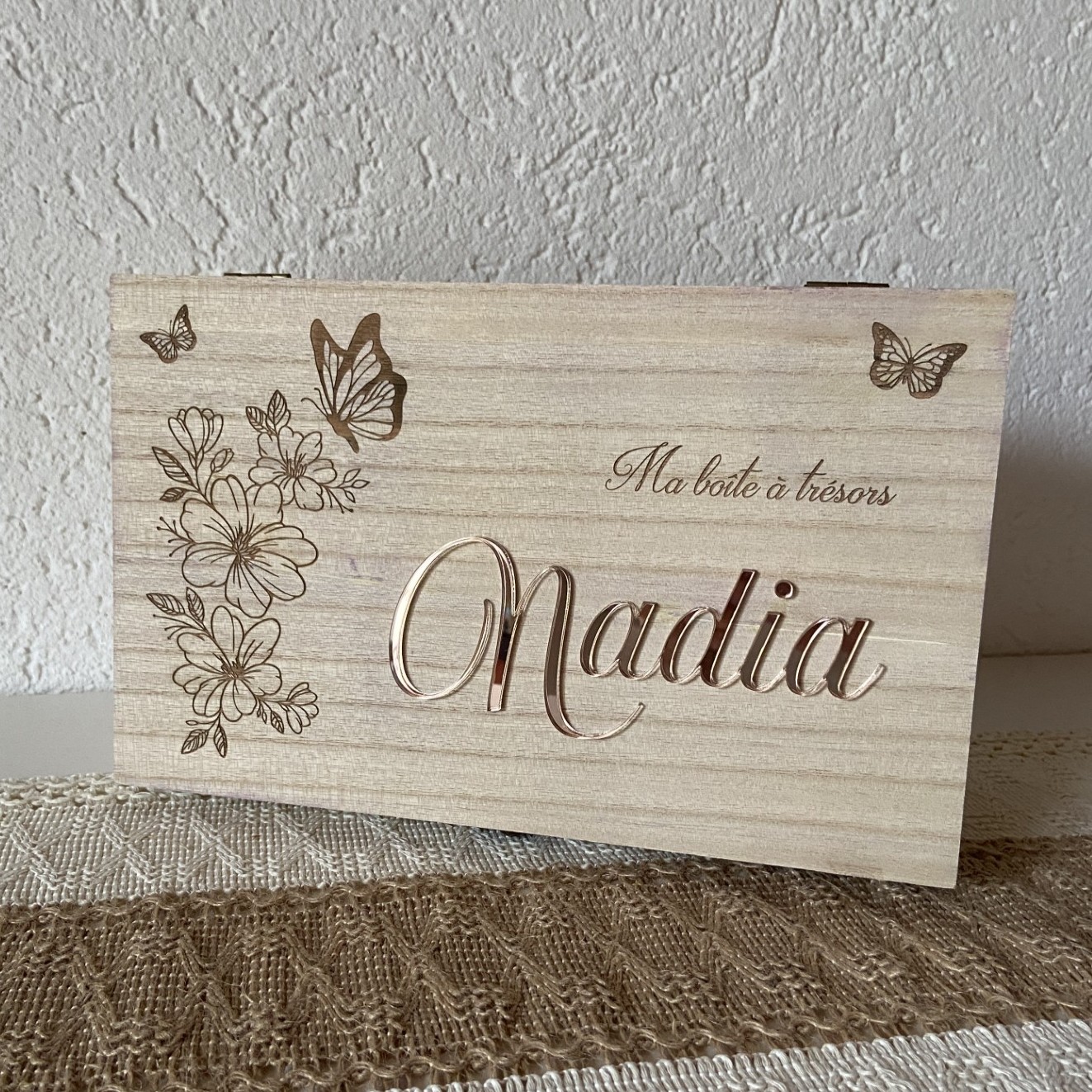 Boîte en bois avec prénom en acrylique “Fleurs et Papillons”