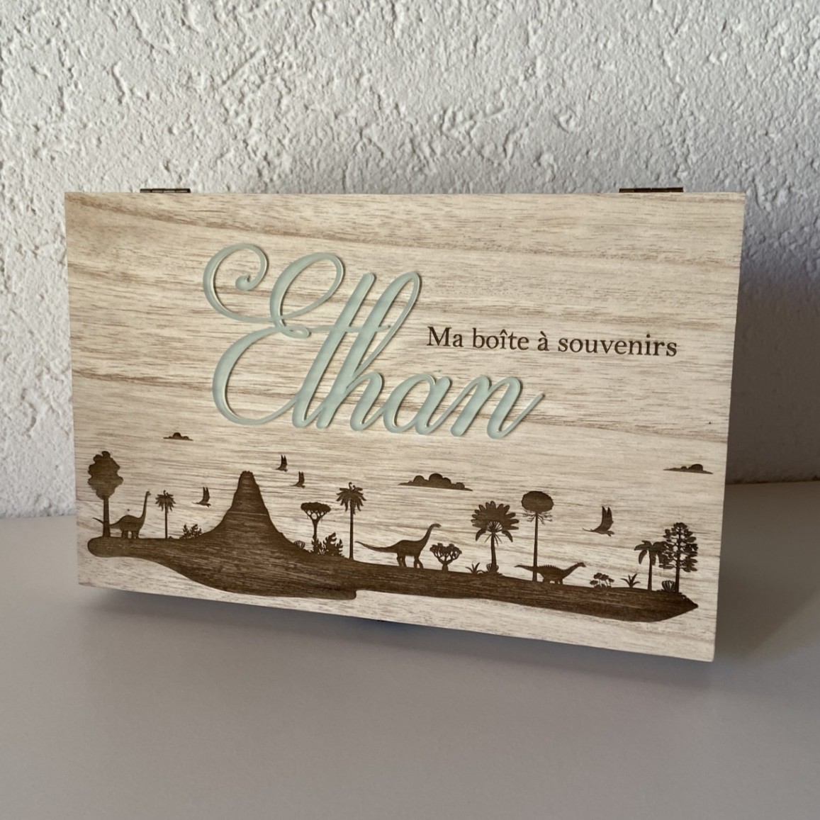 Boîte en bois avec prénom en acrylique “Dino world”