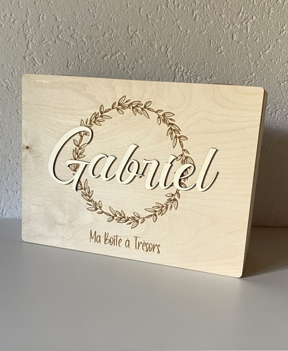 Grande boîte en bois avec prénom “Couronne de feuille”