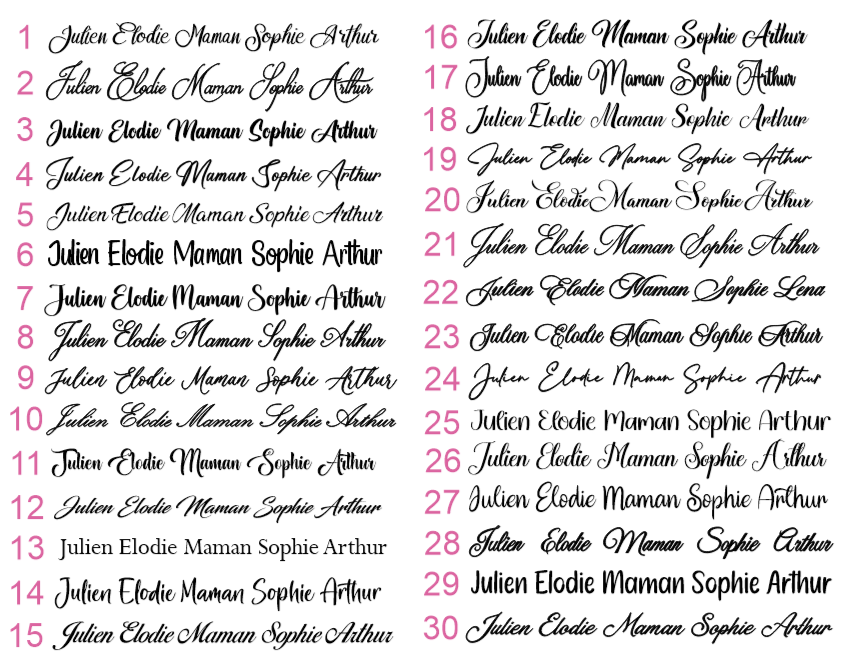 Merci de préciser le style d’écriture que vous aimeriez ainsi que le prénom (photo).