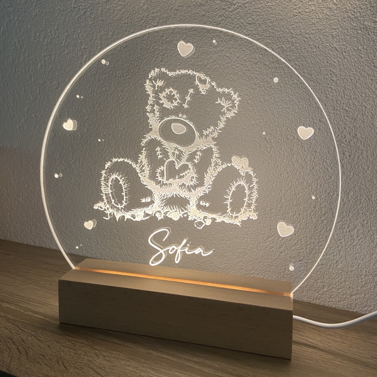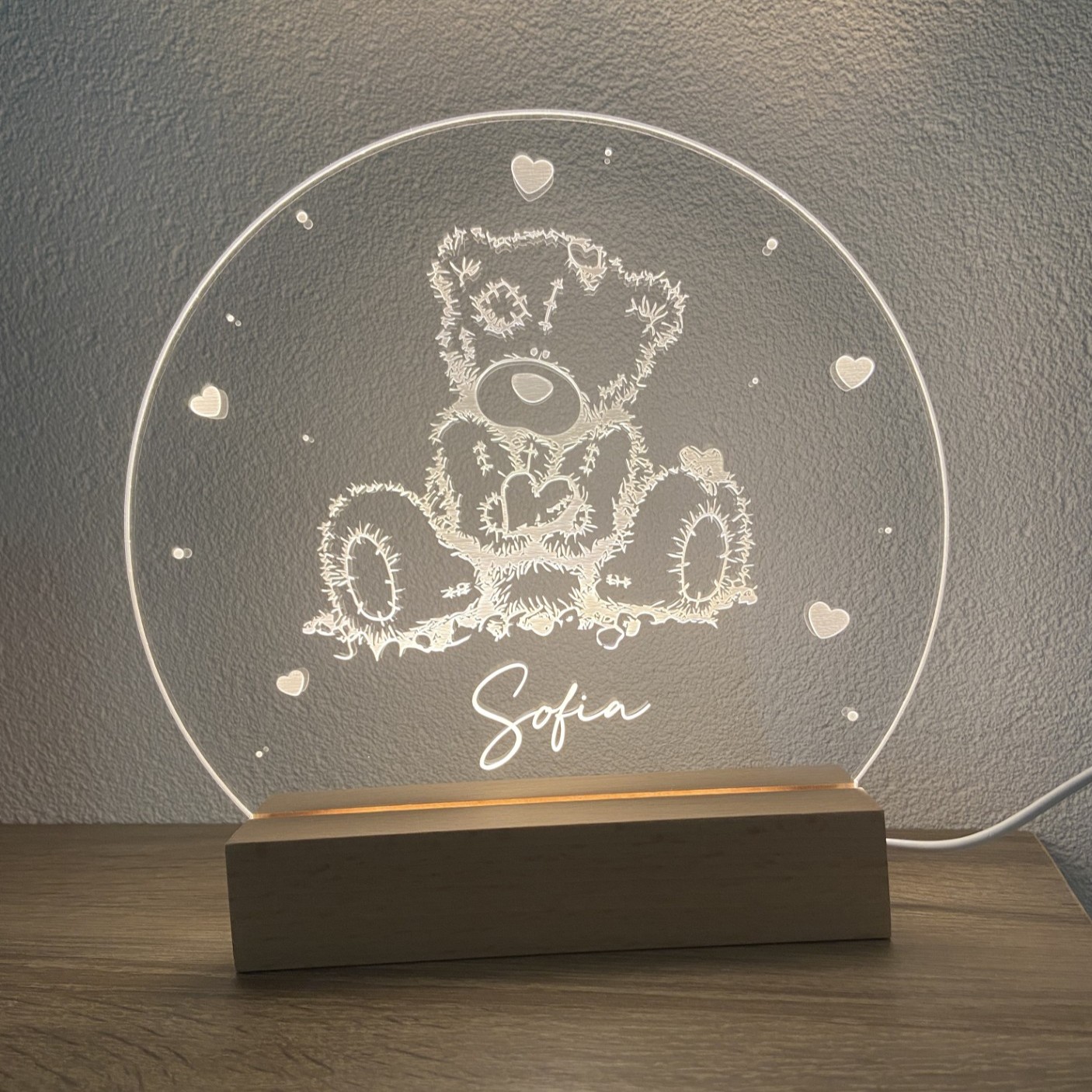 Lampe LED (lumière chaude) avec prénom personnalisable. Facile à utiliser, elle est équipée d’un câble avec interrupteur marche/arrêt et se branche à la prise mural.