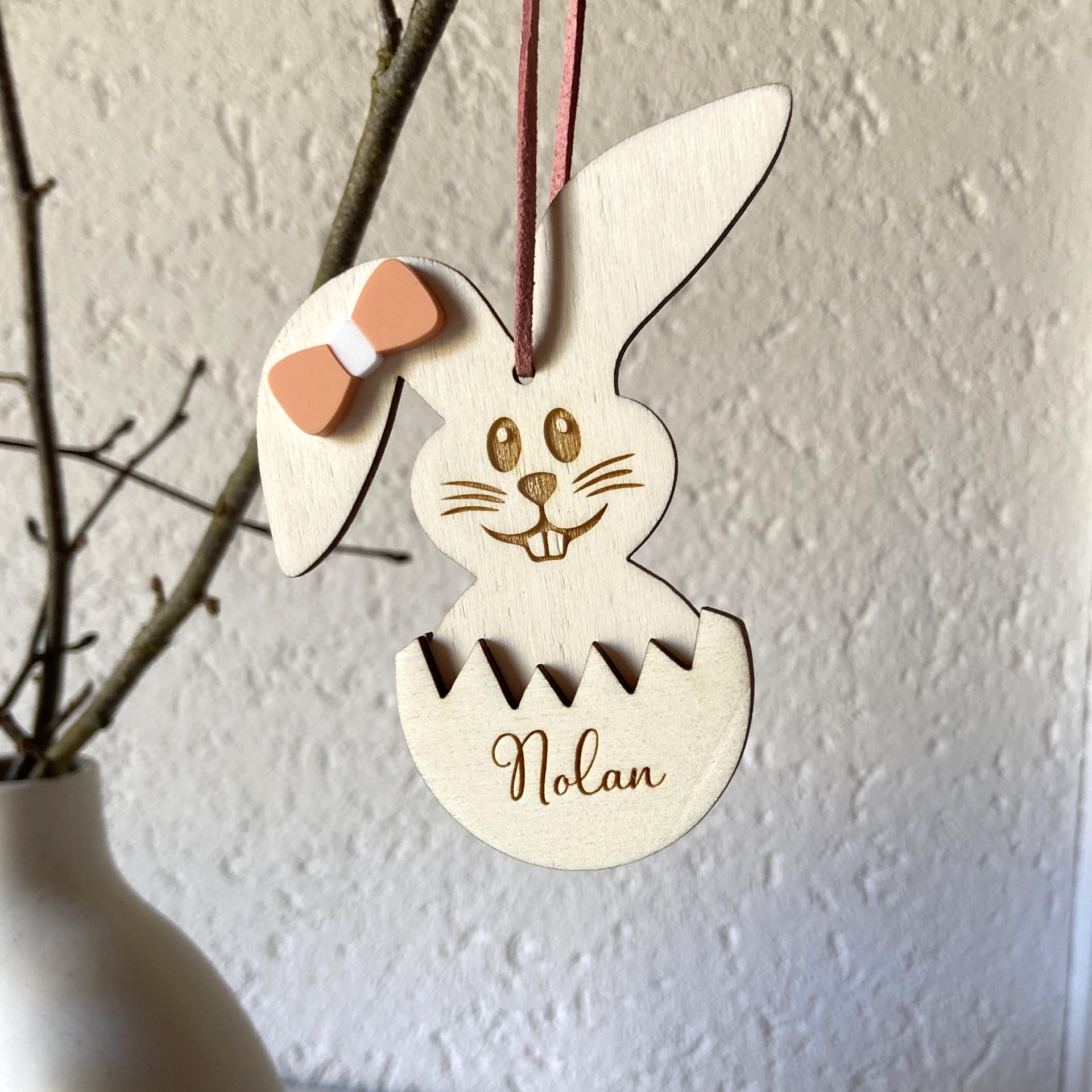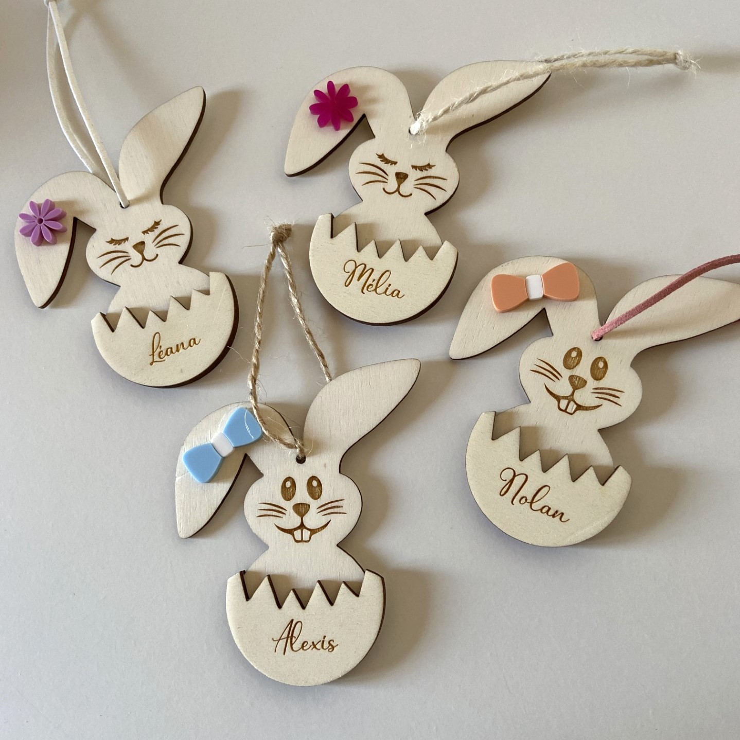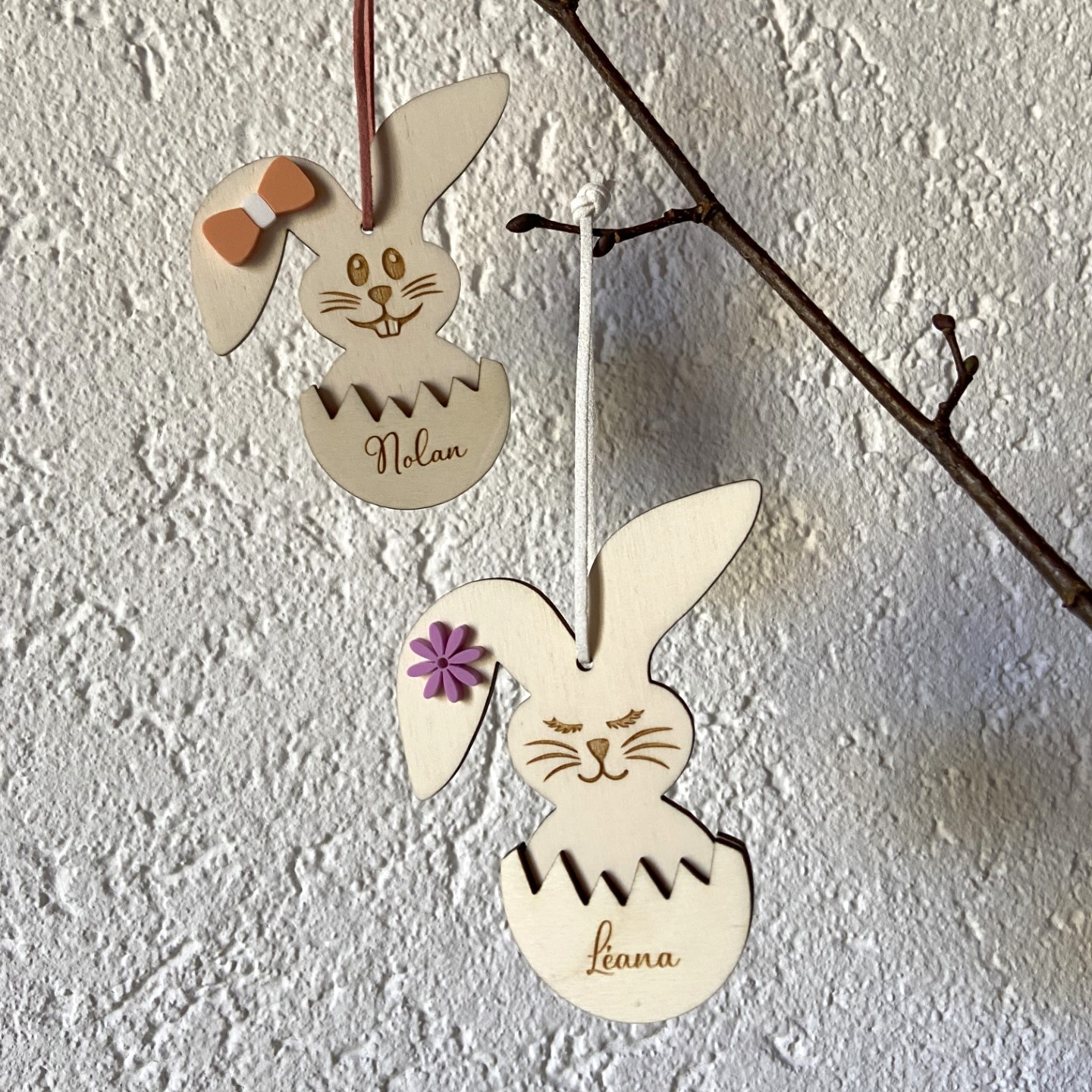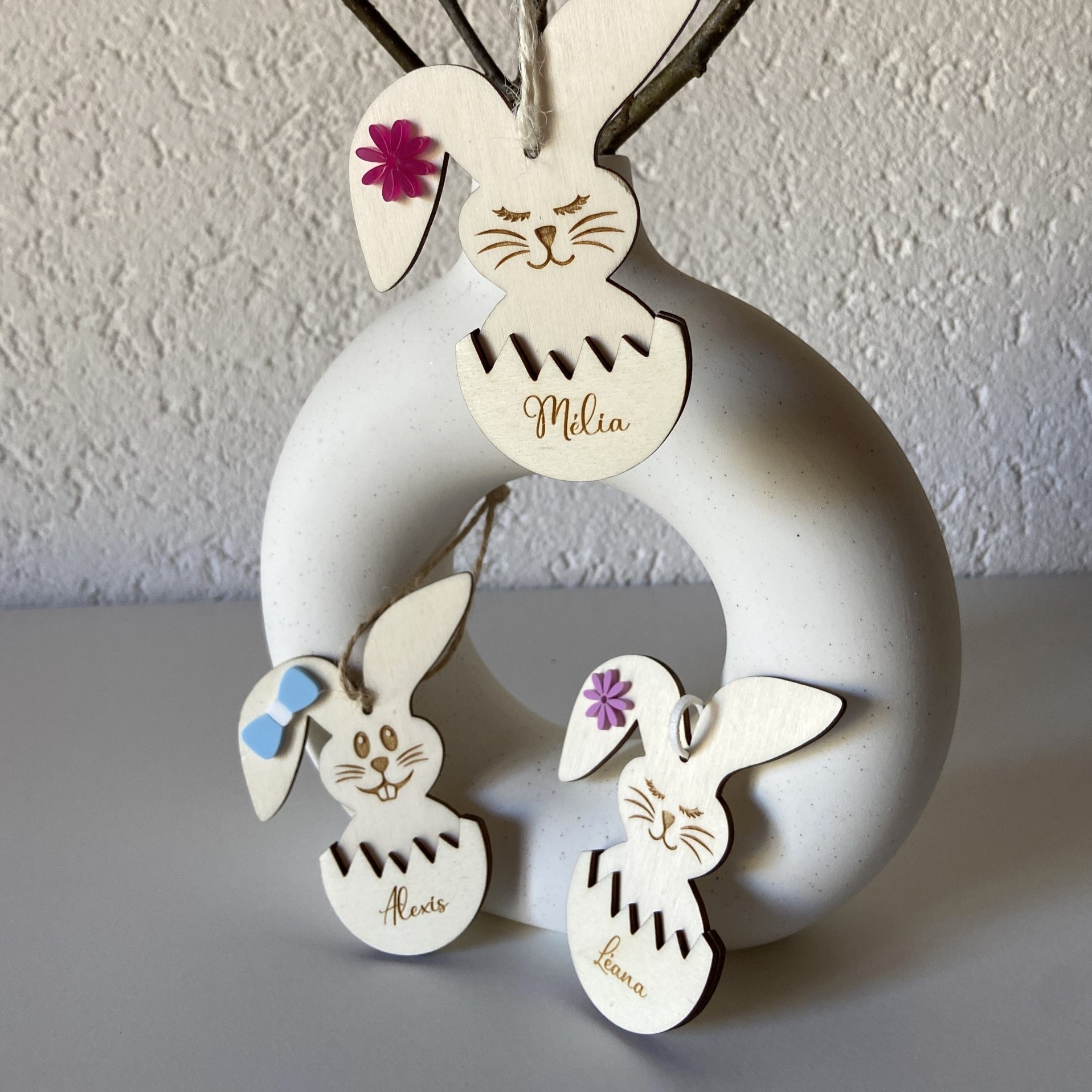 Petit lapin à suspendre avec prénom et déco personnalisable.