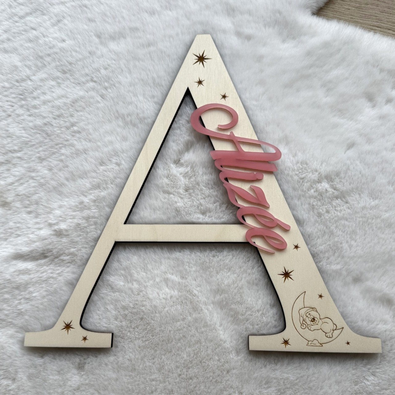 Apportez une touche douce et originale à la décoration avec cette lettre prénom en bois personnalisable. La lettre est réalisée en bois avec une jolie gravure délicate, tandis que le prénom est découpé en acrylique pour un rendu moderne et élégant.