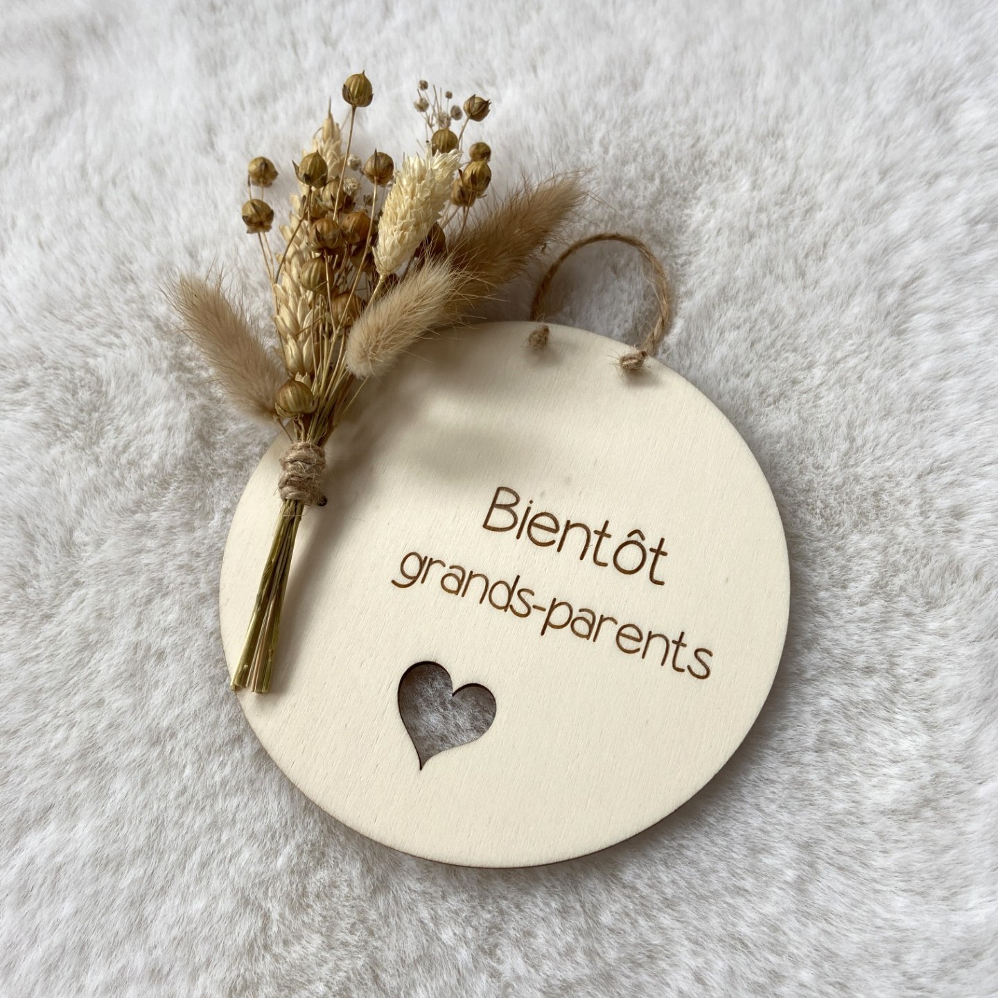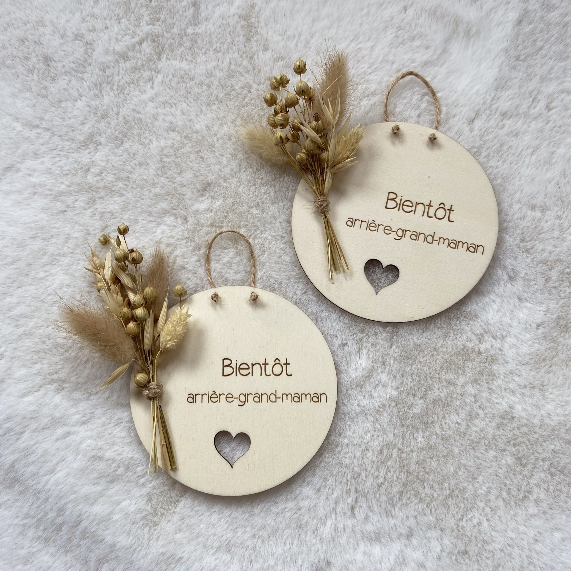 Joli panneau rond en bois, délicatement décoré d’un petit bouquet de fleurs séchées pour une touche naturelle.