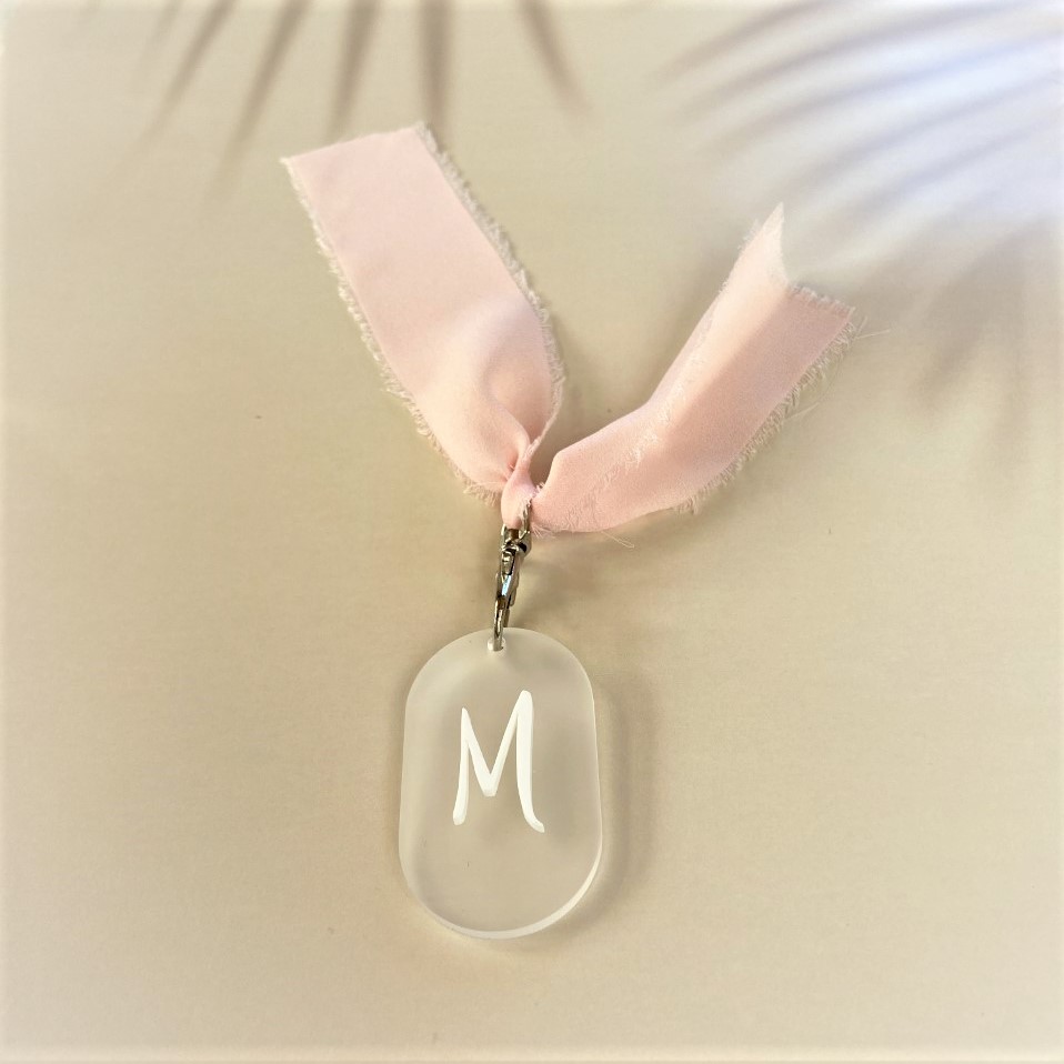 Vous pourrez choisir la couleur de la lettre en plexi, le ruban et le mousqueton.